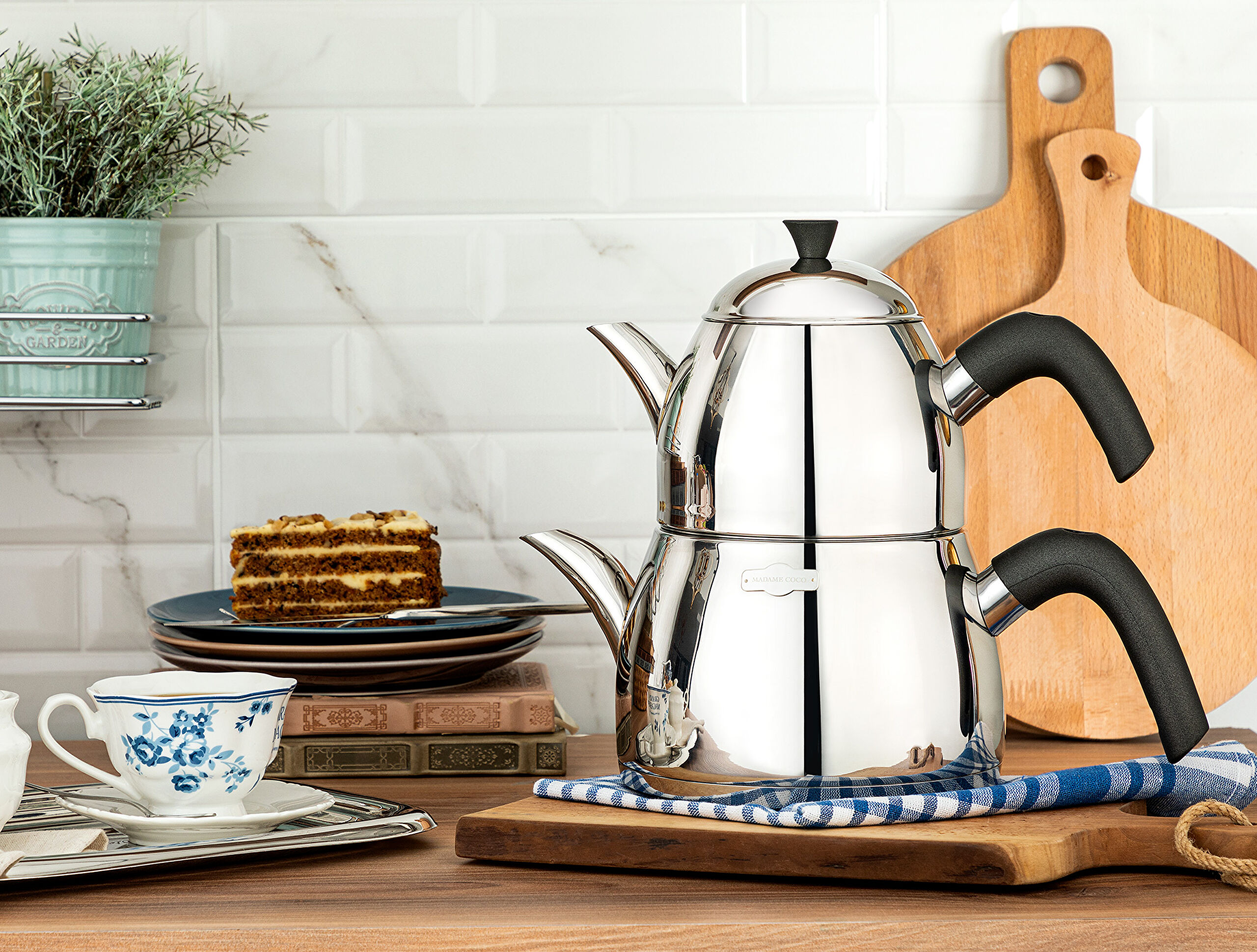 Add an aesthetic touch to your tea pleasure with the design and sparkling exterior of the Abreuvoir Teapot Set. While its durable stainless steel structure will save you time, it will be your greatest helper in your crowded invitations with its large size teapot and water bottle capacity.