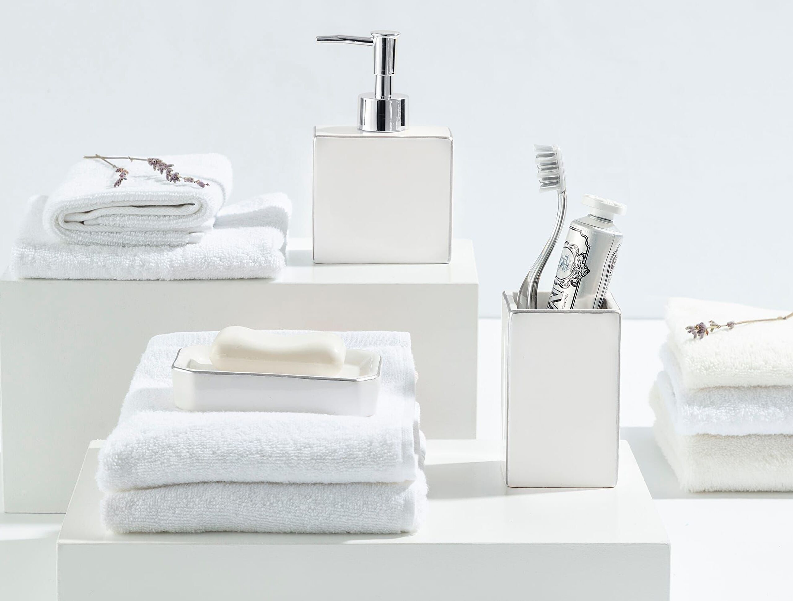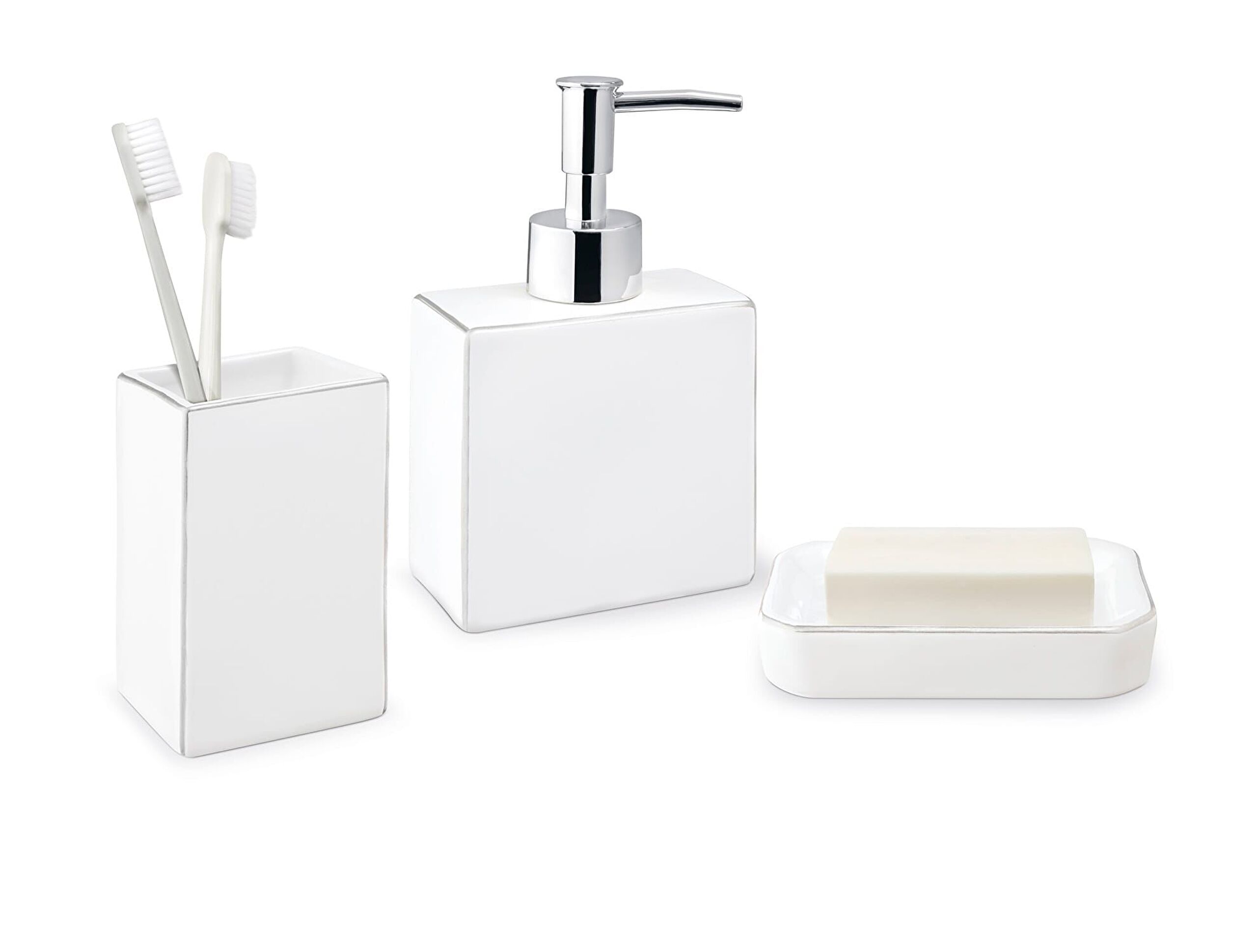 Opmerkelijke grote veranderingen in uw badkamer beginnen met een kleine touch! U kunt een nieuwe stijl aan uw badkamer geven met een uniek ontwerp bestaande uit een stevige zeepschaal, een vloeibare zeepdispenser met pomp en een tandenborstelhouder.
